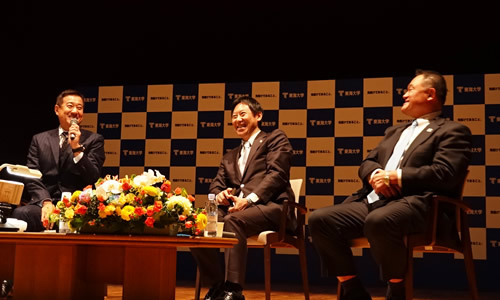 第1部 鈴木大地氏(スポーツ庁長官)による講演、第2部 山下泰裕副学長、原辰徳客員教授、鈴木氏、長田渚左氏(コーディネーター)による座談会を開催しました。これからのスポーツ振興や2020年のオリンピック・パラリンピックに関する貴重な講演に加え、今回限りの豪華メンバーによる座談会で、それぞれのスポーツにまつわるエピソードなども満載で会場も終始楽しい雰囲気と笑いに包まれました。