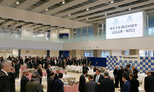 講演・座談会会場から二号館カフェラウンジに会場を移し祝賀会が行われました。体育学部を卒業生や関係者など300人以上の方々にご参加いただきました。会場の大迫力大型液晶ビジョンで学生出演の動画や体育学部応援動画を上映。原辰徳客員教授への野球殿堂入りサプライズ企画などもあり大盛況となりました。ご参加いただいた皆様、ご支援、応援いただいた方々、皆様に改めて感謝申し上げます!